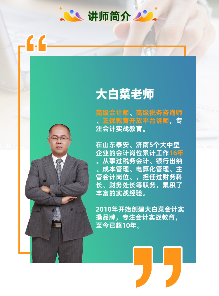 原创《大白菜会计实战教程》,已在山东省版权局登记。大白菜会计学堂商标也已注册!大白菜老师在正保教育、大成云、会计教练、之了课堂、山财网、龙图信息、航天科技都讲解过多期的会计、退税实战教程!老师讲解通俗,课程结构合理,细节直抓学习痛点,受到万千学员的好评!!!